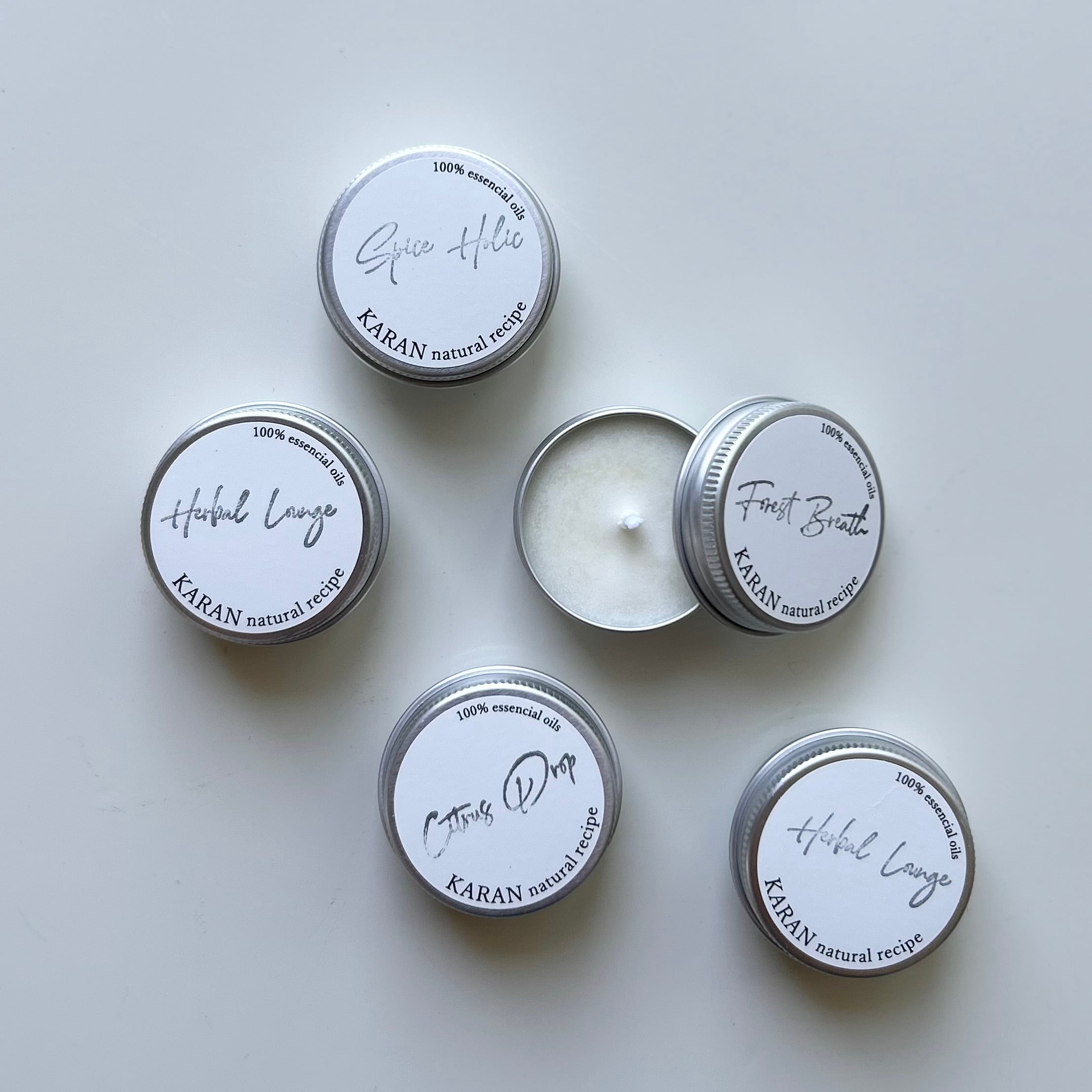ティーライトサイズのミニ缶キャンドル5セットです。KARANオリジナルブレンド5種全てをお楽しみ頂けます。蓋つきなので香りを逃さず、シンプルな明かりが楽しめます。香りサンプルとしてもぜひご利用ください。
